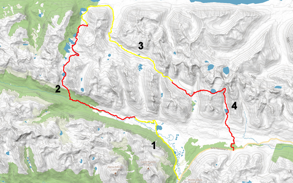 מתחילים לעלות דרומה בסבך של העצים עד הלגונה השניה ממקום הלינה. תוך כדי ההליכה חוצים את הנחל ממזרח למערב וחוזר חלילה. לפני הלגונה בצמוד לאוכף נמצא מפל מדהים! שווה לעצור להתפעל ממנו ומהנוף שנשקף ממנו, מטורף. ממשיכים לעלות דרומה מהצד המזרחי של הלגונה בטיפוס חד כלפיי מעלה. מגיעים לעוד לגונה וגם אותה עוקפים ממזרח. כדי לעקוף את לגונב מאריפוסה חייבים לעלות מזרחה בעלייה חדה מאוד. ממשיכים על הרכס בשני שליש גובה ועוקפים את הלגונה הבאה מדרום מאותו צד, עד שמגיעים לאוכף "סינקו לגונס". מהאוכף יורדים דרומה בעקבות הרוג'ומים עד לגונה ואלדיויאסו. את הלגונה עוקפים מהצד המזרחי ומתחילים לרדת דרומה לכיוון נחל אוליביה. נצמדים לצד המזרחי של הנחל ומגיעים עד לסלע ענק שמוצב קרוב לפיצול הערוצים. מהסלע מתחילים ללכת דרום מזרח עם ריו אוליביה. כל הדרך משתדלים ללכת על קרחות ואדמה ספוגית בצידו הצפוני של הנחל. אחרי הפיצול ערוצים המרובע ניתן למצוא המון מקומות לעשות בהם את הלילה.