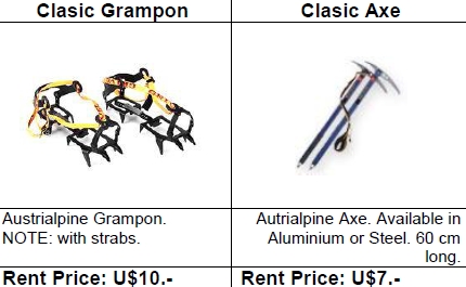 בכל אתר תיירותי בפטגוניה, למעשה מברילוצ'ה ופוקון ועד אושואיה, תמצאו חברות השכרת ציוד (תוכלו לרכוש ציוד אולם המחירים יקרים). המחיר הנקוב הוא ליום לפריט אולם אם תשכירו את הציוד לתקופה של מספר ימים ואף תקחו מגוון גדול של פריטים המחיר יצנח עד 50% וזאת בהתאם לביקוש ולכן המחירים שנקובים במדריך זה הנם מחירי מחירון רשמיים ומכן המחיר רק ירד.