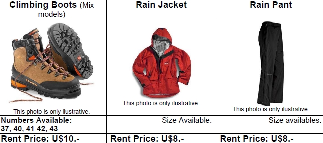 בפרו ובוליביה הציוד שמסופק אינו כולל את הפריטים האישים כגון נעליים/סנדלים, שק שינה, מזרון אבל כולל את כל השאר. במידה ותרצו להשכיר את הציוד לאורך כל הטרק או המסלול תשלמו דולרים בודדים ליום על שק שינה, מזרון וסנדלים (מאוד נפוץ אצל מי שיוצא לראפטינג). אם תרצו להשכיר ציוד נוסף, תמצאו כי שווה לכם לצאת לטרק בצורה מסודרת – השכרת של אוהלים, ציוד קמפינג, אוכל, חמורים שייקחו את כל הציוד – מגיע בסופו של דבר לאותה עלות שיעלה לכם לצאת לטרק בקבוצה מסודרת, עם מדריך, סבלים וטבחים שידאגו לכם להכל. לכן השכרת ציוד מעבר לפריטים האישים הוא שולי וזניח במדינות כמו פרו ובוליביה.