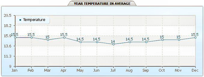 להלן טבלת טמפרטורה ממוצעת לחודשי השנה, טמפרטורה ממוצעת ביום ובלילה, טמפרטורה מקסימלית ומינימלית שנמדדו בשנים האחרונות, מספר ימי הגשם, שלג וערפל ממוצעים. בטבלה השניה נוכל לראות את גרף הטמפרטורה הממוצעת לפי חודשים.