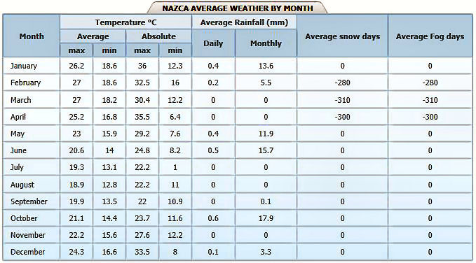 מזג האוויר בנאסקה דומה למזג האוויר בשאר ערי החוף כגון לימה ופיסקו , ניתן להגיע לנאסקה כל השנה כאשר בעונה (חורף) קריר ונעים מאוד לעשות את הסקי בלי להזיע.