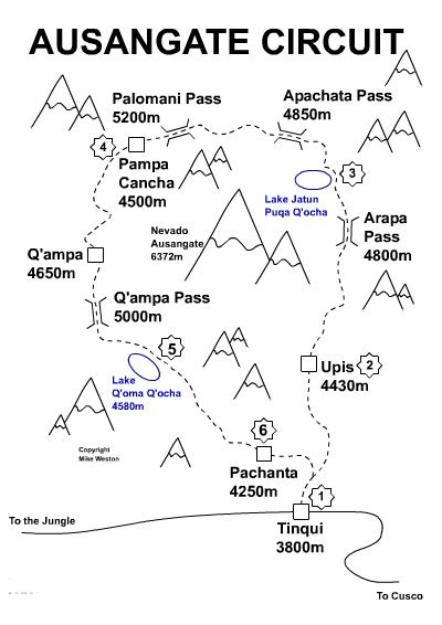 המסלול הפופלארי ביותר הוא סובב אזאנגאטה במשך 7 ימים / 6 לילות אשר מתחיל ומסתיים בכפר אנדי בשם TINQUI ועובר ב 3 מעברים כאשר 2 מהם מעל ל 5000מ'. זה חשוב מאוד להתאקלם לגבהים באיזור לפני היציאה לטרק וההמלצה אומרת לפחות 3 ימים בקוסקו (או מקום מקביל בגבוה). מבית חברות הטרקים מספקות סוסים, אחד לכל רוכב. המסלול לעתים תלול ומסוכן ובחלקים האלו המסלול נעשה בהליכה. סה"כ המסלול הוא כ 60% ברכיבה ובכ 40% בהליכה רגלית. אם מסיבה כשלהי אתם לא מרגישים בנוח לרכב על סוס (חוויה אדירה) ניתן לעשות את הטרק בגרסה שונה שהיא רגלית בלבד.